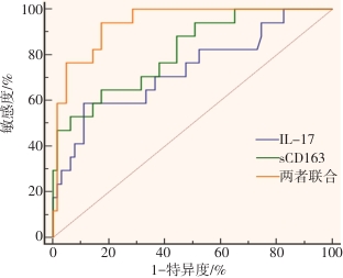 Abstract:Objective To investigate the predictive value of serum interleukin-17 (IL-17) and soluble hemoglobin scavenger receptor 163 (sCD163) for early anastomotic leakage in patients with colorectal cancer after laparoscopic surgery.Methods From June 2022 to June 2024, 80 colorectal cancer patients who underwent laparoscopic surgery were selected as the study subjects. Patients were subdivided into an anastomotic leakage group (17 cases) and a non-anastomotic leakage group (63 cases) according to whether an anastomotic leakage occurred within 7 d postoperatively. Enzyme-linked immunosorbent assay (ELISA) was applied to detect the levels of serum IL-17 and sCD163 in patients on preoperative day 1, postoperative day 1, postoperative day 3, postoperative day 5, and postoperative day 7. The clinical data of the two groups were compared. Multivariate Logistic regression was applied to analyze the influencing factors of early anastomotic leakage in colorectal cancer patients after laparoscopic surgery. The receiver operating characteristic curve (ROC curve) was applied to analyze the predictive value of serum IL-17 and sCD163 levels for early anastomotic leakage in colorectal cancer patients after laparoscopic surgery.Results The percentage of distance between tumor and anus < 7 cm was higher in the anastomotic leakage group than that in the non-anastomotic leakage group, and the amount of drainage was more than that in the non-anastomotic leakage group at 7 d postoperatively, the differences were statistically significant (P < 0.05). There were statistically significant differences in the levels of serum IL-17 and sCD163 between the two groups of patients at different time points, as well as in time and interaction effects (P < 0.05). Distance between tumor and anus <7 cm (OR^ = 3.176, 95%CI: 1.128 ~ 8.940), serum IL-17 level ≥ 43.95 pg/mL at 3 d postoperatively (OR^ = 2.145, 95%CI: 1.281 ~ 3.592), and serum sCD163 level ≥ 81.02 pg/mL at 5 d postoperatively (OR^ = 1.852, 95%CI: 1.225 ~ 2.801) were the risk factors of early anastomotic leakage in patients with colorectal cancer after laparoscopic surgery (P < 0.05). The area under the curve (AUC) of the combination of serum IL-17 and sCD163 in predicting early anastomotic leakage in colorectal cancer patients after laparoscopic surgery was 0.923, which was superior to the single diagnosis of serum IL-17 and sCD163 (Zcombination-IL-17 = 2.77, Zcombination-sCD163 = 2.11, P < 0.05).Conclusion Serum IL-17 and sCD163 levels are elevated in colorectal cancer patients with early anastomotic leakage after laparoscopic surgery. The combined detection of the two has certain clinical value in predicting early anastomotic leakage in patients with colorectal cancer after laparoscopic surgery.