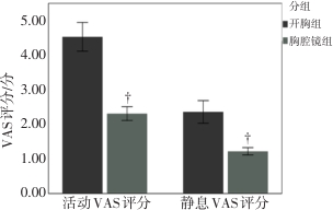 Abstract:Objective To explore the impact of thoracoscopic surgery on the immune function and clinical efficacy of patients with tuberculous pleurisy.Methods A retrospective analysis was conducted on the clinical data of 85 patients with tuberculous pleurisy who received and underwent surgical operations from July 2022 to January 2024. The patients were divided into the thoracotomy group (22 cases) and the thoracoscopic group (63 cases) according to different surgical methods. The perioperative indicators, pain degree, levels of serum inflammatory factors, liver and kidney functions, nutrition-related indicators, clinical efficacy and adverse reactions of the two groups were compared.Results The intraoperative blood loss and drainage volume in the thoracoscopic group were significantly less than those in the thoracotomy group, and the hospital stay, operation time and catheter insertion time were significantly shorter than those in the thoracotomy group. The differences were statistically significant (P < 0.05). The visual analogue scale (VAS) scores of the thoracoscopic group at rest and during activity 24 hours after surgery were significantly lower than those of the thoracotomy group, and the differences were statistically significant (P < 0.05). The postoperative 24 h C-reactive protein (CRP) in the thoracoscopic group was significantly lower than that in the thoracotomy group, and the difference was statistically significant (P < 0.05). The levels of postoperative creatinine (Cr), aspartate transaminase (AST), and alanine transaminase (ALT) 24 h after surgery in the thoracoscopic group were significantly lower than those in the thoracotomy group, and the differences were statistically significant (P < 0.05). The prognostic nutritional index (PNI), albumin, hemoglobin and lymphocyte levels 24 h after surgery in the thoracoscopic group were significantly higher than those in the thoracotomy group, and the differences were statistically significant (P < 0.05). The total effective rate of the thoracoscopic group was significantly higher than that of the thoracotomy group, and the difference was statistically significant (P < 0.05). There was no statistically significant difference in procalcitonin (PCT) and the total incidence of adverse reactions after surgery between the two groups (P > 0.05).Conclusion For patients with tuberculous pleurisy, thoracoscopic surgery has more advantages than thoracotomy in reducing inflammatory responses, minimizing intraoperative blood loss, and improving nutritional status, and it is safe and effective. It is worth applying in clinical practice.