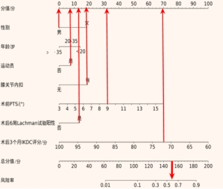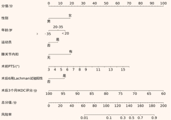 Abstract:Objective To construct a visualized model for early warning of contralateral ligament injury risk after arthroscopic anterior cruciate ligament (ACL) reconstruction, and to conduct internal validation of the warning model, with a view to providing a concise, intuitive, and efficient individualized assessment tool for medical staff to evaluate the risk of contralateral ligament injury in patients with ACL injury after surgery.Methods 583 patients with ACL injuries who underwent arthroscopic ACL reconstruction surgery from January 2021 to January 2024 were selected. Excluding 51 cases those were lost to follow-up or had incomplete data, clinical data of 532 patients were finally included. According to whether there was a contralateral ligament injury, patients were categorized into an occurrence group (n = 42) and a non-occurrence group (n = 490). Data from the two groups of patients were compared using single-factor analysis. R software was employed to obtain predictive factors and regression coefficients through multivariate binary Logistic regression analysis. A visual nomogram early warning model was established, and internal and external validations were conducted using calibration curves, C index, and decision curves to assess consistency, discrimination, and clinical utility.Results Multivariate Logistic regression analysis revealed that athletes, females, knee joint buckling, positive Lachman test results at 6 weeks post-surgery, International Knee Documentation Committee (IKDC) score at 3 months post-surgery, age < 20 years, and preoperative posterior tibial slope (PTS) were influencing factors for contralateral ligament injury after arthroscopic ACL reconstruction (P < 0.05). Based on this, a visual nomogram warning model was established using R software. After Bootstrap testing, the model demonstrated a C index of 0.892. Draw the receiver operating characteristic curve (ROC curve), the model's area under the curve (AUC) values in the internal and external validation sets were 0.820 (95%CI: 0.751 ~ 0.890) and 0.799 (95%CI: 0.712 ~ 0.886), respectively. The calibration curves indicated that the slopes in both the internal and external validation sets were approximately 1. In the decision curve, the model demonstrated significant net benefit in both the internal and external validation sets.Conclusion The contralateral ligament injury after arthroscopic ACL reconstruction is influenced by age, gender, positive Lachman test at 6 weeks postoperatively, knee joint buckling, IKDC score at 3 months postoperatively, preoperative PTS, and athlete status. The visualized early warning model constructed based on these factors has good clinical application value and can guide clinicians to carry out targeted interventions.