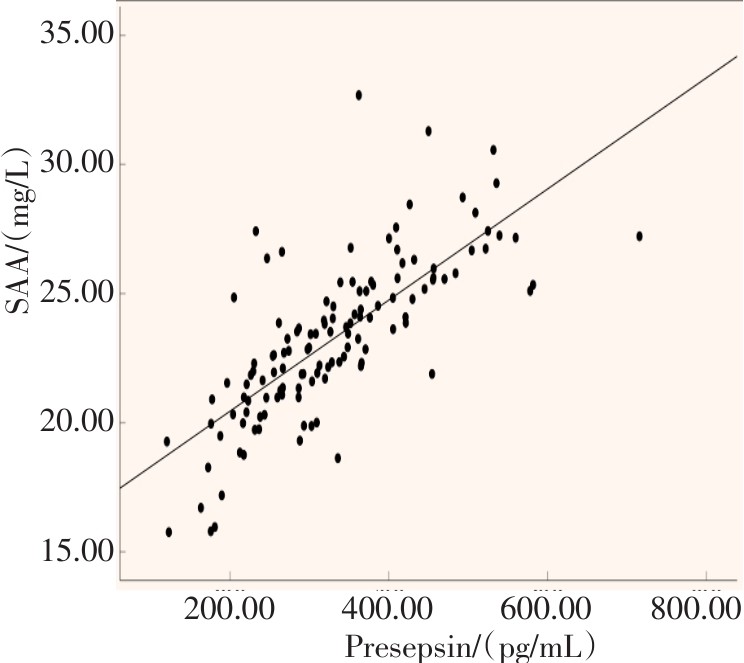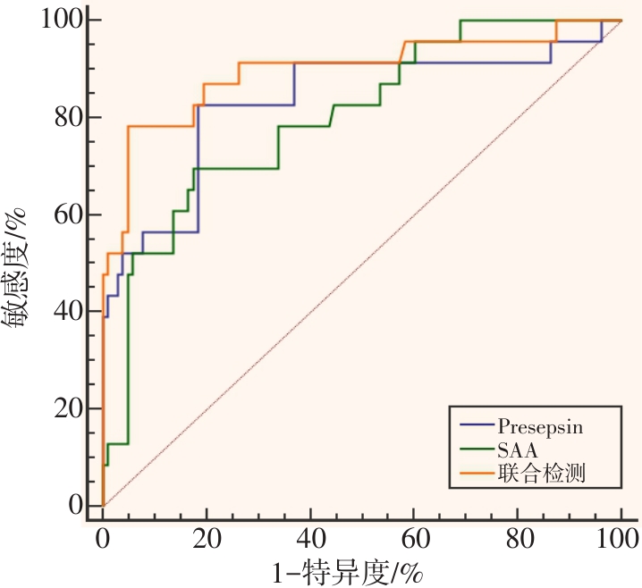 摘要:目的 探讨结直肠癌患者腹腔镜术后血清淀粉样蛋白A(SAA)和可溶性CD14亚型(Presepsin)的表达水平及其对早期吻合口瘘的预测价值。方法 选取2021年10月-2024年4月该院收治的结直肠癌患者126例,依据患者腹腔镜术后3 d内是否发生吻合口瘘,将患者分为未发生吻合口瘘组(对照组,n = 103)和发生吻合口瘘组(观察组,n = 23)。采用酶联免疫吸附试验(ELISA)检测两组患者术后血清Presepsin和SAA表达水平;采用Pearson法,探讨结直肠癌患者腹腔镜术后血清Presepsin和SAA表达水平的相关性;采用多因素Logistic回归模型,分析影响结直肠癌患者腹腔镜术后发生早期吻合口瘘的独立危险因素;绘制受试者操作特征曲线(ROC curve),评估结直肠癌患者腹腔镜术后血清Presepsin和SAA表达水平对早期吻合口瘘的预测价值。结果 与对照组比较,观察组肿瘤距肛门距离≥7 cm患者比例明显减少,术中出血量明显增加,差异均有统计学意义(P < 0.05);观察组术后血清Presepsin和SAA表达水平明显高于对照组,差异均有统计学意义(P < 0.05)。结直肠癌患者腹腔镜术后血清Presepsin和SAA表达水平呈正相关(r = 0.749,P = 0.016);血清Presepsin高于389.23 pg/mL和SAA表达水平高于25.10 mg/L,是影响结直肠癌患者腹腔镜术后发生早期吻合口瘘的独立危险因素,肿瘤距肛门距离≥7 cm为保护因素。血清Presepsin和SAA单独检测,以及联合检测,预测结直肠癌患者腹腔镜术后发生早期吻合口瘘的曲线下面积(AUC)分别为:0.834(95%CI:0.757~0.894)、0.801(95%CI:0.720~0.866)和0.897(95%CI:0.830~0.944),联合检测优于血清Presepsin和SAA单独检测(Z两者联合-Presepsin = 2.085、Z两者联合-SAA = 2.010,均P < 0.05)。结论 结直肠癌患者腹腔镜术后血清Presepsin和SAA表达水平升高,两者联合检测对早期吻合口瘘具有较高的预测价值。