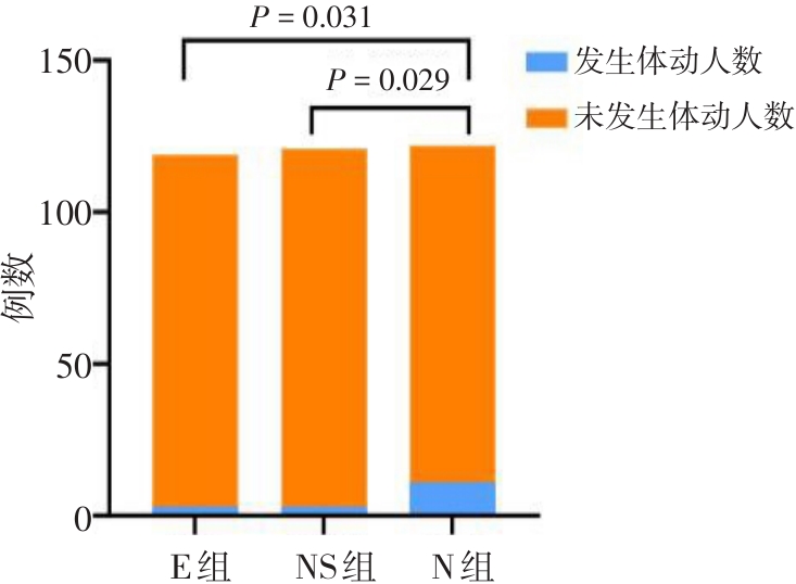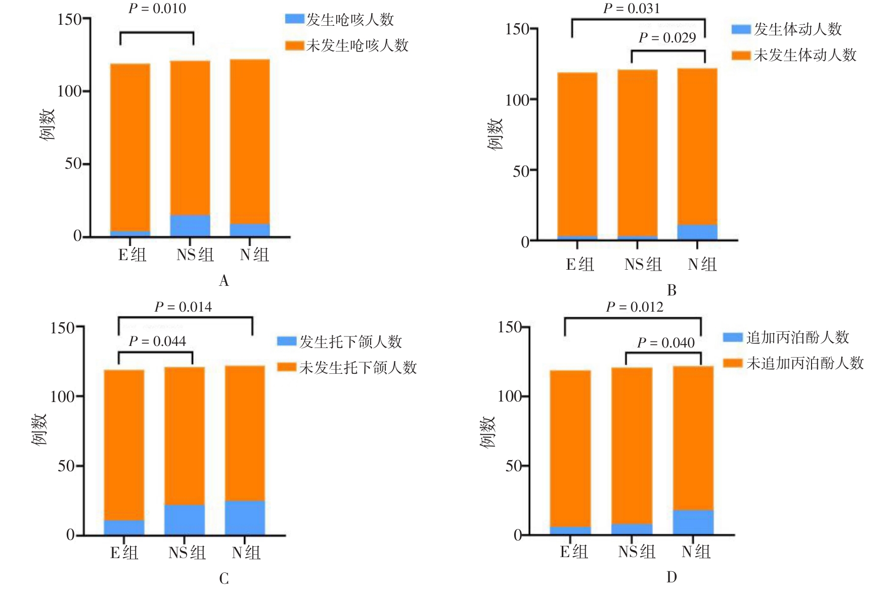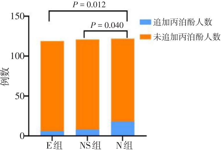 摘要:目的 比较末梢灌注指数(TPI)与睫毛反射消失指导无痛胃镜进镜时间,以寻找胃镜检查的最佳进镜时机。方法 选择2024年1月-2024年6月该院择期行无痛胃镜检查的患者362例,按照随机数表法分为N组(122例,睫毛反射消失后直接进镜检查)、NS组(121例,睫毛反射消失30 s后进镜检查)和E组[119例,TPI连续增大(新测量的数值 > 前一测量数值3次以上)后进镜]。比较3组患者麻醉诱导前(T0)、进胃镜前(T1)、胃镜过咽喉时(T2)和镜检完成后(T3)的心率(HR)、平均动脉压(MAP)和经皮动脉血氧饱和度(SpO2)的变化。比较3组患者进镜等待时间(全身麻醉诱导完成后到进镜时刻)和不良反应发生率。结果 N组进镜等待时间为(5.52±2.17)s,明显短于E组的(18.60±3.89)s和NS组的(35.74±2.17)s,差异均有统计学意义(P < 0.01)。E组T1时点SpO2明显高于N组和NS组,差异均有统计学意义(P < 0.01),3组患者T0、T2和T3时点的SpO2比较,差异均无统计学意义(P > 0.05);3组患者T0、T1、T2和T3时点HR和MAP比较,差异均无统计学意义(P > 0.05);3组患者T0时点的MAP和HR明显高于T1、T2和T3时点,差异均有统计学意义(P < 0.05)。E组托下颌发生率明显低于NS组和N组,体动发生率和丙泊酚追加率明显低于N组,呛咳发生率明显低于NS组,差异均有统计学意义(P < 0.05)。结论 TPI预测无痛胃镜的进镜时机,具有简便、无创、客观和实时等优势,明显优于通过睫毛反射来指导进镜时机。当TPI从低点出现连续增大时,是无痛胃镜进镜的最佳时机。