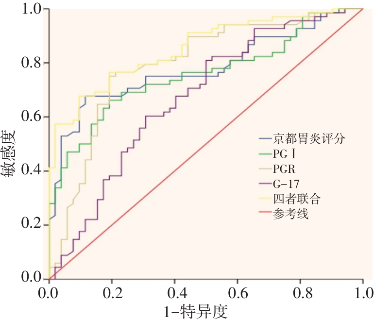 摘要:目的 以胃镜病理活检作为金标准,探讨基于胃镜检查的京都胃炎评分、胃蛋白酶原(PG)联合胃泌素-17(G-17)预测中老年幽门螺杆菌(Hp)感染阳性的萎缩性胃炎患者的最佳截断值。方法 选择2022年8月-2023年6月于该院消化内科就诊并经胃镜检查和病理活检确诊为萎缩性胃炎的120例中老年患者作为研究对象,且所有患者均经14C-尿素呼气试验确诊为Hp阳性。入组后对每位患者进行胃镜病理活检,并根据活检结果分为萎缩性胃炎组(AG组)68例和非萎缩性胃炎组(非AG组)52例;根据木村-竹本(Kimura-Takemoto)分类法,进一步对68例萎缩性胃炎进行分组,分为轻度AG组(n = 12)、中度AG组(n = 32)和重度AG组(n = 24)。基于胃镜检查,对所有患者进行京都胃炎评分,同时,用化学发光法测定患者的血清胃蛋白酶原Ⅰ(PGⅠ)、胃蛋白酶原Ⅱ(PGⅡ)及G-17水平,并计算胃蛋白酶原比值(PGR)。使用受试者操作特征曲线(ROC curve)评价京都胃炎评分、血清PG和G-17对中老年Hp感染阳性的萎缩性胃炎患者的预测价值。结果 AG组与非AG组京都胃炎评分、血清PGⅠ、PGR和G-17水平比较,差异均有统计学意义(t = 13.38,P = 0.000;t = 50.84,P = 0.000;t = 26.44,P = 0.000;t = 9.44,P = 0.000),AG组京都胃炎评分高于非AG组(P < 0.05),AG组血清PGⅠ、PGR和G-17水平均低于非AG组(P < 0.05);AG组与非AG组血清PGⅡ水平比较,差异无统计学意义(t = 1.24,P = 0.219)。轻度AG组、中度AG组和重度AG组京都胃炎评分、血清PGⅠ、PGR和G-17水平比较,差异均有统计学意义(F = 33.95,P = 0.000;F = 81.99,P = 0.000;F = 67.36,P = 0.001;F = 33.50,P = 0.004),轻度AG组京都胃炎评分低于中度AG组和重度AG组(P < 0.05),中度AG组低于重度AG组(P < 0.05)。轻度AG组和中度AG组血清PGⅠ及PGR水平高于重度AG组(P < 0.05),轻度AG组高于中度AG组(P < 0.05)。轻度AG组血清G-17水平低于中度AG组和重度AG组(P < 0.05),中度AG组和重度AG组比较,差异无统计学意义(P > 0.05)。轻度AG组、中度AG组和重度AG组血清PGⅡ水平比较,差异无统计学意义(F = 1.03,P = 0.364)。京都胃炎评分、血清PGⅠ、PGR和G-17预测中老年Hp感染阳性的萎缩性胃炎患者的最佳截断值分别为2.78分、38.26 μg/L、1.92和9.54 pmol/L。其中,京都胃炎评分预测中老年Hp感染阳性的萎缩性胃炎患者的曲线下面积(AUC)为0.780,敏感度为71.42%,特异度为78.62%;PGⅠ预测中老年Hp感染阳性的萎缩性胃炎患者的AUC为0.757,敏感度为66.27%,特异度为83.25%;PGR预测中老年Hp感染阳性的萎缩性胃炎患者的AUC为0.792,敏感度为76.23%,特异度为87.35%;G-17预测中老年Hp感染阳性的萎缩性胃炎患者的AUC为0.672,敏感度为60.24%,特异度为74.28%;四者联合预测中老年Hp感染阳性的萎缩性胃炎患者的AUC为0.871,敏感度为81.28%,特异度为87.36%。结论 基于胃镜检查的京都胃炎评分联合血清PGⅠ、PGR和G-17检测,对于中老年Hp感染阳性的萎缩性胃炎患者,具有良好的预测价值,其预测中老年Hp感染阳性的萎缩性胃炎患者的最佳截断值分别为2.78分、38.26 μg/L、1.92和9.54 pmol/L。