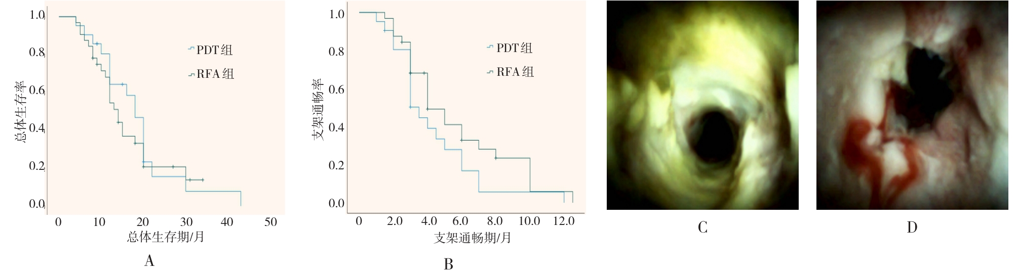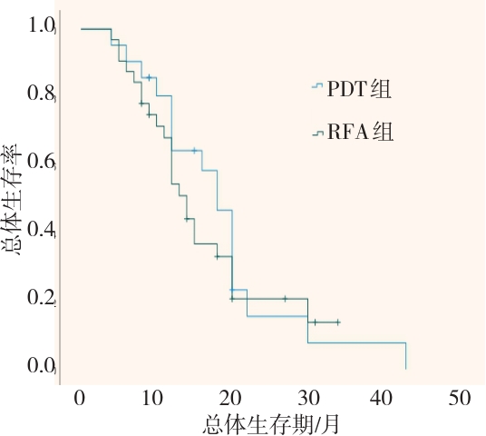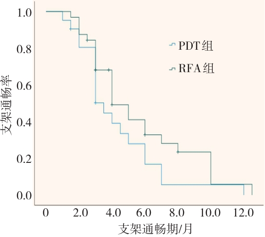摘要:目的 比较内镜射频消融术(RFA)与光动力疗法(PDT)联合胆道支架置入治疗不可切除肝外胆管癌的远期疗效。方法 回顾性分析2018年2月-2023年2月于该院接受内镜RFA或PDT治疗的胆管癌患者的临床资料,根据手术方法不同,将患者分为RFA组(n = 32,行内镜RFA联合胆道支架置入)和PDT组(n = 21,行内镜PDT联合胆道支架置入)。比较两组患者治疗次数、支架通畅期、总体生存期和并发症发生率,并分析影响患者生存期的危险因素。结果 RFA组与PDT组总体生存期分别为14.0(95%CI:11.8~16.2)和18.0(95%CI:15.4~20.6)个月,支架中位通畅期分别为4.0(95%CI:2.7~5.3)和3.5(95%CI:2.3~4.7)个月,差异均无统计学意义(P > 0.05);多因素Cox回归分析显示,内镜下RFA或PDT治疗次数的HR^ = 2.417,≥ 2次是影响总体生存期的保护性因素(P = 0.018),而TNM分期的HR^ = 0.300,Ⅲ期至Ⅳ期是影响总体生存期的危险性因素(P = 0.002);两组患者临床成功率均为100.00%;两组患者并发症总发生率[28.13%(9/32)和23.81%(5/21)]比较,差异无统计学意义(P > 0.05)。结论 内镜RFA与PDT联合胆道支架置入,治疗不可切除肝外胆管癌的远期疗效相似。内镜RFA或PDT序贯治疗 ≥ 2次,能够有效地延长患者的总体生存期。