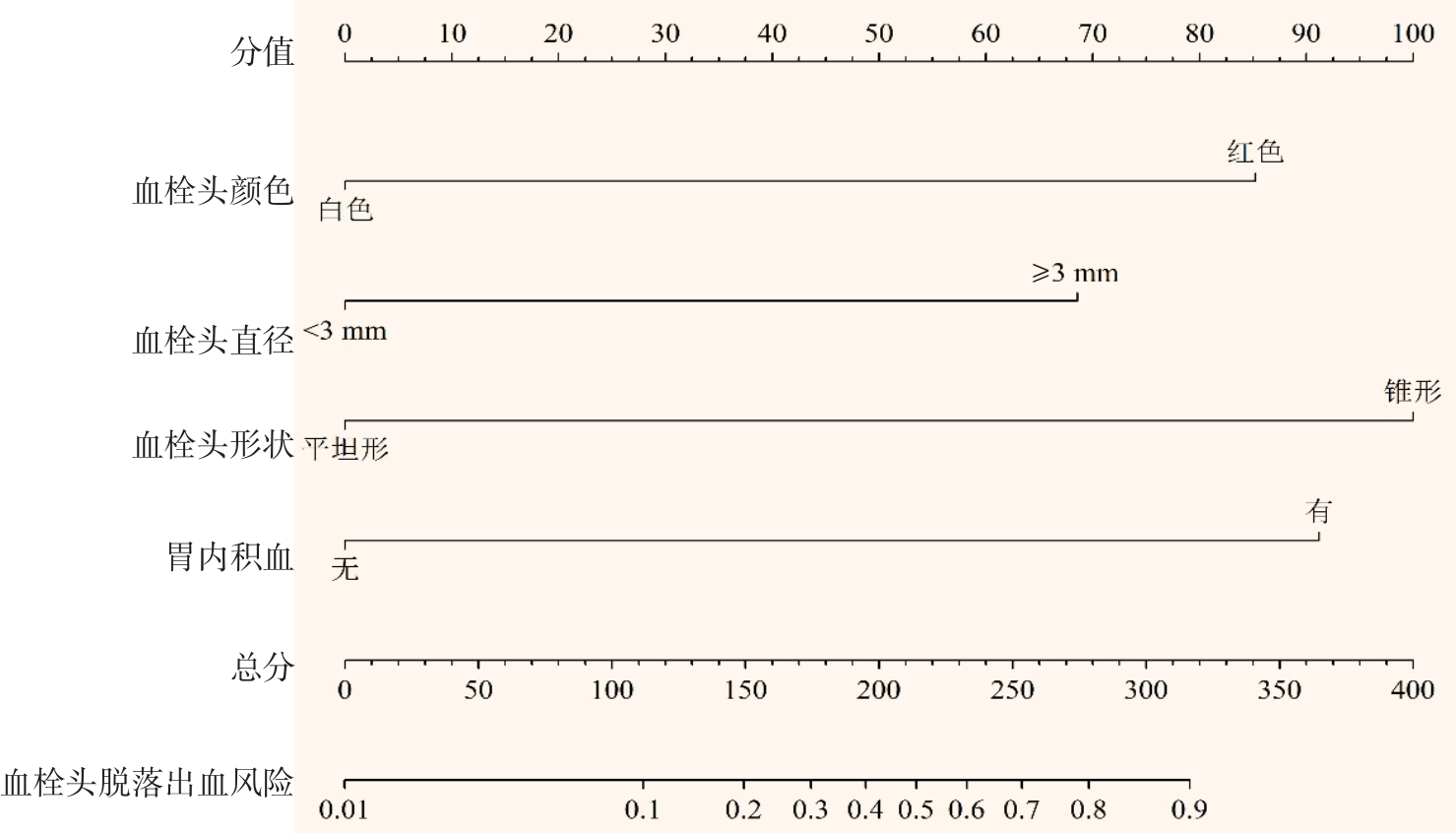摘要:目的 探讨食管静脉曲张患者内镜诊疗过程中血栓头脱落出血的危险因素,并构建其风险预测模型。方法 回顾性分析2009年2月-2024年7月该院行内镜检查发现食管静脉曲张伴血栓头形成的患者209例,根据内镜诊疗过程中是否发生血栓头脱落出血,分为:未脱落组(186例)和脱落组(23例)。比较两组患者临床特征和内镜特征,将单因素分析中差异有统计学意义的因素纳入多因素Logistic回归分析,探讨其独立危险因素。通过R语言软件构建列线图风险预测模型,并评价其预测效能。结果 多因素Logistic回归分析显示,血栓头颜色为红色(OR^ = 6.231,95%CI:1.748~22.208)、血栓头直径 ≥ 3 mm(OR^ = 4.355,95%CI:1.341~14.144)、血栓头形状为锥形(OR^ = 8.555,95%CI:2.427~30.154)和胃内存在积血(OR^ = 7.079,95%CI:1.665~30.103)是内镜诊治过程中血栓头发生脱落出血的独立危险因素。Nomogram列线图预测模型的敏感度为0.870(95%CI:0.732~1.000),特异度为0.887(95%CI:0.842~0.933)。结论 血栓头颜色为红色、形状为锥形、直径 ≥ 3mm和胃内有积血是影响内镜诊疗过程中血栓头脱落出血的独立危险因素,应针对以上因素及时干预,以预防术中血栓头脱落出血。