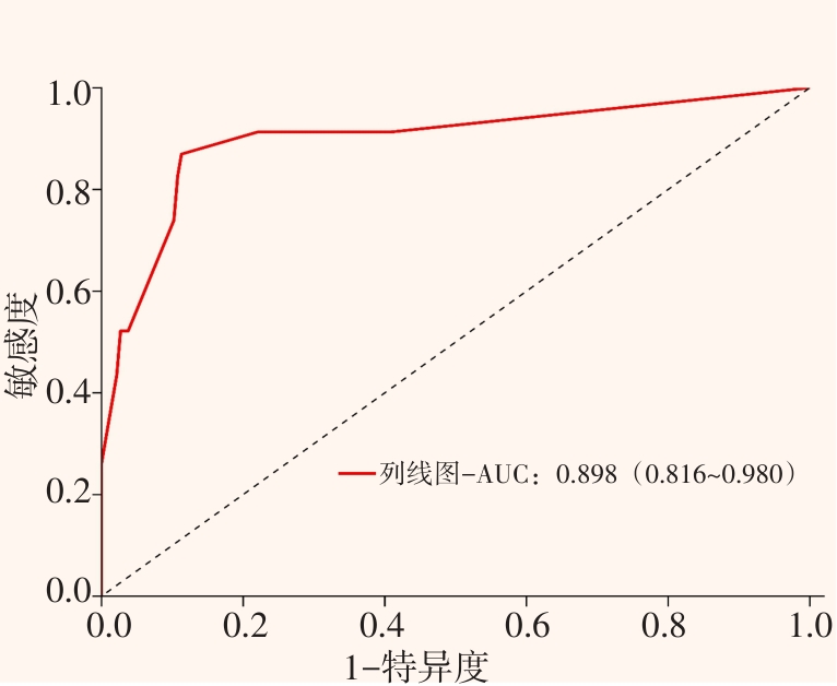 摘要:目的 探讨经内镜治疗的上消化道出血(UGIH)患者再出血的高危因素及预防策略,并构建预测模型。方法 选取2020年1月-2023年12月该院收治的97例经内镜治疗后再出血的UGIH患者作为观察组,另选取178例同期收治的内镜治疗后未再出血的UGIH患者作为对照组,两组内镜治疗后随访时间均为1年。比较两组患者临床资料,采用多因素Logistic回归模型,分析UGIH患者内镜治疗后再出血的高危因素,并构建预测模型,绘制受试者操作特征曲线(ROC curve),分析该模型对UGIH患者内镜治疗后再出血的预测价值。结果 观察组肝硬化、休克、内镜下活动性出血、Forrest分级为Ⅰa至Ⅰb级、血红蛋白水平 ≤ 90 g/L和血小板水平≤100×109/L的患者占比分别为55.67%、14.43%、37.11%、62.89%、23.71%和23.71%,高于对照组的41.57%、2.25%、18.54%、44.38%、3.37%和7.87%,血清D-二聚体(D-D)水平高于对照组,出血量多于对照组,凝血酶原时间(PT)长于对照组(P < 0.05)。多因素Logistic回归模型分析显示,肝硬化(OR^ = 2.423,95%CI:1.124~5.224)、休克(OR^ = 6.897,95%CI:1.487~31.995)、内镜下活动性出血(OR^ = 2.604,95%CI:1.109~6.118)、Forrest分级为Ⅰa至Ⅰb级(OR^ = 2.494,95%CI:1.162~5.354)、血红蛋白水平 ≤ 90 g/L(OR^ = 5.270,95%CI:1.797~15.442)、血小板水平 ≤ 100×109/L(OR^ = 5.018,95%CI:1.733~14.531)、出血量 > 189.61 mL(OR^ = 1.025,95%CI:1.016~1.034)和PT > 15.99 s(OR^ = 1.996,95%CI:1.618~2.460)均为UGIH患者内镜治疗后再出血的独立危险因素(P < 0.05)。回归方程模型:logit(P) = -18.551 + 肝硬化×0.885+休克×1.931+内镜下活动性出血×0.957+Forrest分级×0.914 + 血红蛋白水平×1.662 + 血小板水平×1.613 + 出血量×0.025 + PT×0.691。预测UGIH患者内镜治疗后再出血的ROC curve按照诊断概率logit(P)进行绘制,当logit(P) > 0.30时,95%CI为0.891~0.955,诊断敏感度及特异度分别为88.66%和83.15%,曲线下面积(AUC)为0.923。结论 肝硬化、休克、内镜下活动性出血、Forrest分级为Ⅰa至Ⅰb级、血红蛋白水平≤90 g/L、血小板水平≤100×l09/L、出血量 > 189.61 mL和PT > 15.99 s为UGIH患者内镜治疗后再出血的独立危险因素,据此构建的模型预测价值较高,临床可据此针对高危患者给予个性化的干预及处理,以减少或避免再出血的发生。