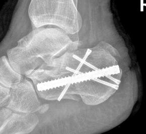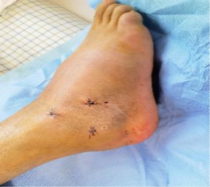 摘要:目的 探讨关节镜技术联合钉中钉系统全内修复跟骨关节内骨折的临床疗效。方法 回顾性分析2021年5月-2024年4月该院骨与关节康复科收治,并获得随访的31例闭合性跟骨关节内骨折患者的临床资料。均采取关节镜技术联合钉中钉系统全内修复手术治疗方案。术前及术后均行跟骨侧轴位X线片及足部CT检查,根据影像学结果对骨折类型进行分型,并评价术后骨折复位情况。比较手术前后跟骨高度、宽度、Bohler角和Gissane角。记录术前等待时间、手术时间、术中出血量、住院时间、术后疼痛视觉模拟评分法(VAS)评分等围手术期相关指标及术后并发症发生情况。采用美国足踝外科协会(AOFAS)评分和Maryland足部评分评估临床疗效。结果 术后影像学检查,可见跟骨术后关节面塌陷骨块复位;跟骨高度明显高于术前,跟骨宽度明显窄于术前,Bohler角较术前明显增大,Gissane角较术前明显缩小,差异均有统计学意义(P < 0.05)。术前等待时间为6(4,7)d,手术时间为(188.77±39.53)min,术中出血量为(59.03±23.00)mL,住院时间为(16.49±4.04)d,术后疼痛VAS评分为2(1,2)分,AOFAS评分为92(90,95)分,Maryland评分为92(90,95)分。结论 采用关节镜技术联合钉中钉系统全内修复跟骨骨折,具有可早期开展手术、创伤小、直视下复位、固定可靠和无切口相关并发症等优点,适用于Sanders Ⅱ型和Ⅲ型跟骨骨折。值得应用于临床。