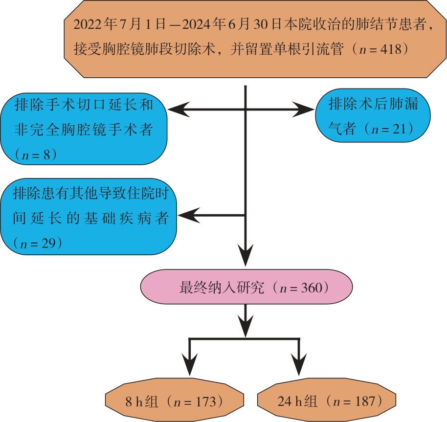 摘要:目的 探讨胸腔镜肺段切除术后根据连续8 h胸腔引流量(PDV)拔除胸腔引流管的可行性和安全性。方法 回顾性分析2022年7月1日-2024年6月30日于该院接受胸腔镜肺段切除术的360例肺结节患者的临床资料。根据8 h PDV拔除胸腔引流管的患者设为8 h组(173例),根据24 h PDV拔除胸腔引流管的患者设为24 h组(187例)。比较两组患者手术相关情况和术后并发症。结果 两组患者手术肺叶、手术时间、术中出血量、清扫淋巴结站数、清扫淋巴数量和术后病理比较,差异均无统计学意义(P > 0.05)。8 h组术后胸腔引流管留置时间和术后住院时间明显短于24 h组,差异均有统计学意义(P < 0.05)。两组患者再次引流率和切口愈合不良率比较,差异均无统计学意义(P > 0.05)。结论 胸腔镜肺段切除术后,根据8 h PDV拔除胸腔引流管是安全的,具有一定可行性。与传统的根据24 h PDV拔除胸腔引流管方案相比,该方法可更早地拔除胸腔引流管,缩短住院时间。值得临床推广应用。
