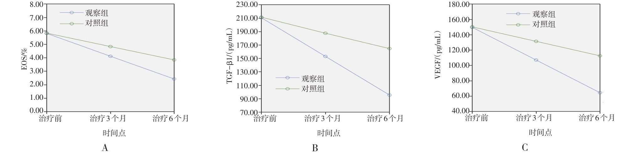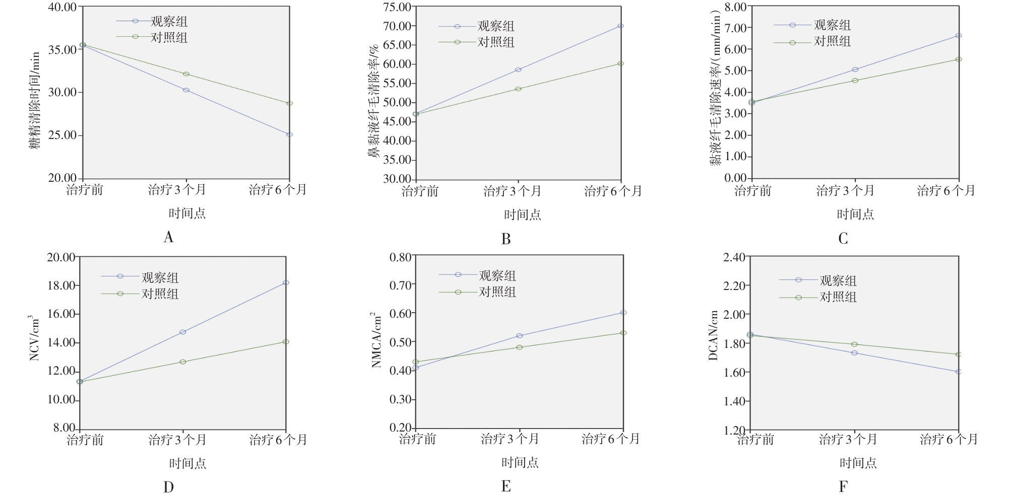 摘要:目的 探讨术前规范化药物治疗对鼻内镜下慢性鼻窦炎(CRS)伴鼻息肉(CRSwNP)患者术后鼻黏膜重塑的影响。方法 选取2022年1月-2023年6月该院收治的CRSwNP患者80例,根据随机数表法将患者分为观察组(n = 40)和对照组(n = 40),对照组给予功能性鼻内镜手术治疗,观察组在对照组的基础上给予术前规范化药物综合治疗。比较两组患者鼻腔黏液纤毛清除功能、鼻功能和鼻黏膜重塑变化;采用广义估计方程(GEE)模型,分析其改善情况;采用多元线性回归模型,分析其与各评分之间的关系;采用双重差分模型,分析治疗效果。结果 两组患者组内不同时点(治疗前、治疗后3个月和治疗后6个月)的糖精清除时间、鼻黏液纤毛清除率、黏液纤毛清除速率、鼻腔容积(NCV)、鼻腔最小横截面积(NMCA)、最小横截面积距前鼻孔距离(DCAN)、嗜酸性粒细胞(EOS)、转化生长因子β1(TGF-β1)和血管内皮细胞生长因子(VEGF)水平比较,差异均有统计学意义(F = 124.36,P = 0.000;F = 113.58,P = 0.000;F = 98.67,P = 0.000;F = 87.37,P = 0.000;F = 107.26,P = 0.000;F = 77.45,P = 0.000;F = 3.80,P = 0.008;F = 2.56,P = 0.012;F = 2.13,P = 0.015);观察组治疗后3和6个月糖精清除时间较对照组短,鼻黏液纤毛清除率较对照组高,黏液纤毛清除速率较对照组快,NCV和NMCA较对照组大,DCAN较对照组短,EOS、TGF-β1和VEGF水平较对照组低,差异均有统计学意义(F = 44.36,P = 0.000;F = 38.23,P = 0.000;F = 30.44,P = 0.000;F = 27.33,P = 0.000;F = 36.11,P = 0.000;F = 22.00,P = 0.000;F = 2.44,P = 0.014;F = 1.89,P = 0.017;F = 1.75,P = 0.021);两组患者糖精清除时间、鼻黏液纤毛清除率、黏液纤毛清除速率、NCV、NMCA、DCAN、EOS、TGF-β1和VEGF水平变化趋势比较,差异均有统计学意义(F = 18.33,P = 0.000;F = 15.78,P = 0.000;F = 13.00,P = 0.000;F = 8.17,P = 0.002;F = 10.23,P = 0.000;F = 4.34,P = 0.004;F = 2.89,P = 0.013;F = 1.67,P = 0.022;F = 1.43,P = 0.031)。GEE分析结果显示,观察组鼻黏液纤毛清除率、黏液纤毛清除速率、NMCA、NCV、DCAN和糖精清除时间的改善情况明显优于对照组,差异均有统计学意义(P < 0.05);治疗后6个月,两组患者Lund-Kennedy评分、Lund-Mackay评分和鼻腔鼻窦结局测试-20(SNOT-20)评分明显低于术前,且观察组明显低于对照组,差异均有统计学意义(P < 0.05);多元线性回归模型分析结果显示,糖精清除时间、DCAN、EOS、TGF-β1、VEGF水平、鼻黏液纤毛清除率、黏液纤毛清除速率、NCV和NMCA与Lund-Kennedy评分、Lund-Mackay评分和SNOT-20量表评分密切相关(P < 0.05)。双重差分模型结果显示,观察组Lund-Kennedy评分、Lund-Mackay评分和SNOT-20量表评分的改善情况明显优于对照组。观察组总有效率为92.50%,明显高于对照组的75.00%,差异均有统计学意义(P < 0.05)。结论 在鼻内镜术前采用规范化药物治疗,可以有效地促进CRSwNP患者鼻黏膜修复,抑制术后鼻腔重塑,且疗效较好,值得临床推广应用。